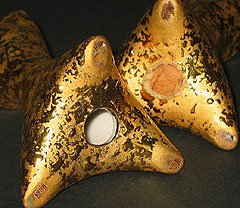 | ●不思議なフォルムがインパクト十分 のS & P。シュールな印象も魅力的で す。本体は金のうわぐすりを施した陶 製で、表面には凸凹を感じる模様があ ります。モノや動物をモチーフにした ものはよく見かけますが、オブジェの ようなデザインのS & Pは珍しいかと 思います。状態は欠けなどもなくとて もきれいですが、片方のストッパーが ありません。 |